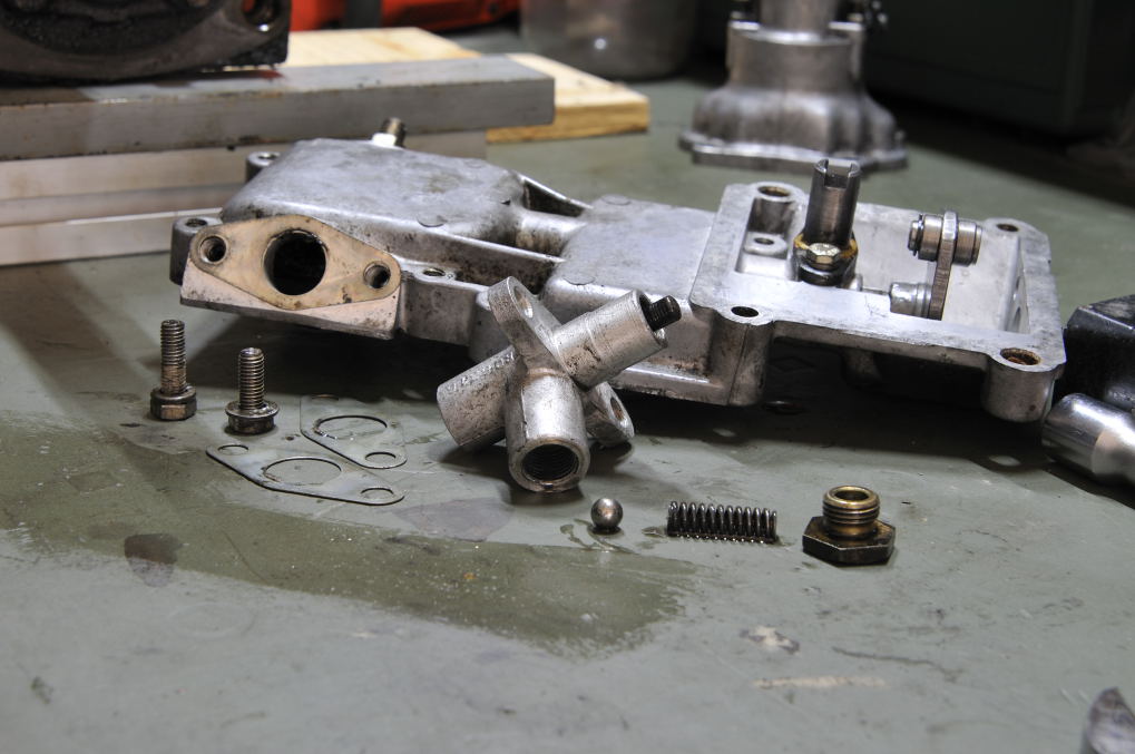 Dévisser les trois vis de fixation du couvercle de la pompe. Clef de 10. Il n'y a rien de plus à démonter pour la pompe. Ne pas essayer d'enlever le tube d'aspiration d'huile. Vérifier seulement qu'il n'est pas colmaté.