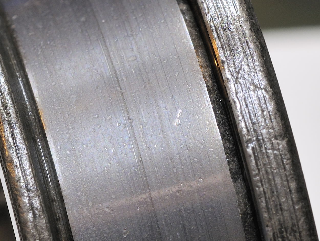Ce roulement montre très bien les très nombreuses cavités (indentations) laissées dans la piste de roulement par des particules solides passées entre les rouleaux et les pistes. De plus certaines particules ont causé un usinage aussi la piste (les nombreuses rainures) Un peu plus près : la surface lunaire n'est pas jalouse La bague externe du roulement suivant montre ce que l'on appelle un micro écaillage dû à un problème d'épaisseur de film lubrifiant trop faible. Enfin, l'état des pistes de roulement des roulements à aiguilles ont une apparence qui laisserait aussi présager un micro écaillage. Mais en fait, l'état n'est pas si mauvais et un remontage serait possible. N'oublions pas que l'huile est filtrée avant d'aller dans les roulements à aiguilles. 2.b Dentures