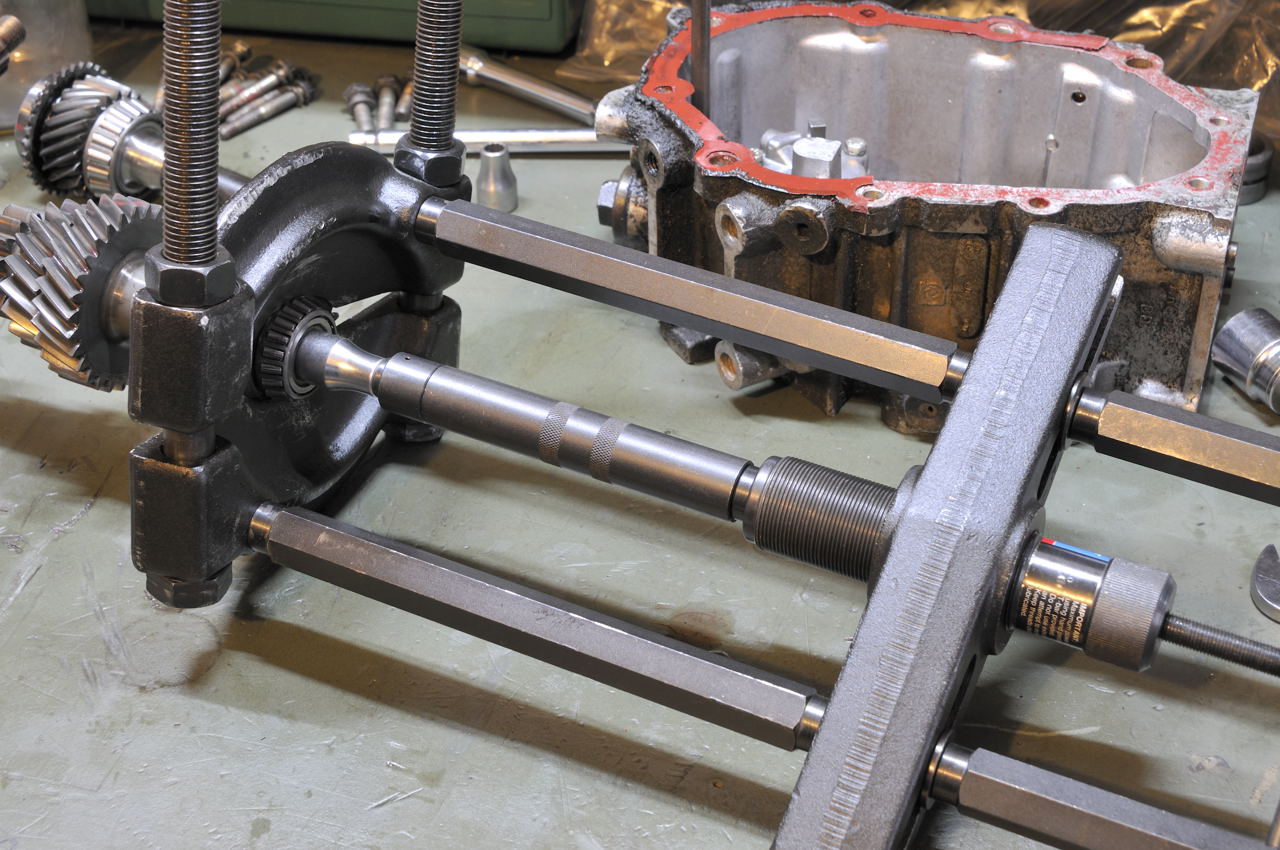 On voit bien les trous de lubrification de l'arbre. Le premier à gauche est l'entrée d'huile et les autres sont la sortie et viennent lubrifier les roulements à aiguilles et synchro. Le bout d'arbre de droite comporte aussi une sortie d'huile pour lubrifier le petit roulement planqué entre l(arbre secondaire et l'abre primaire. Avec le découlleur on enlève le roulement guidant l'arbre primaire par rapport au carter de BV. Two fingers in the noze.