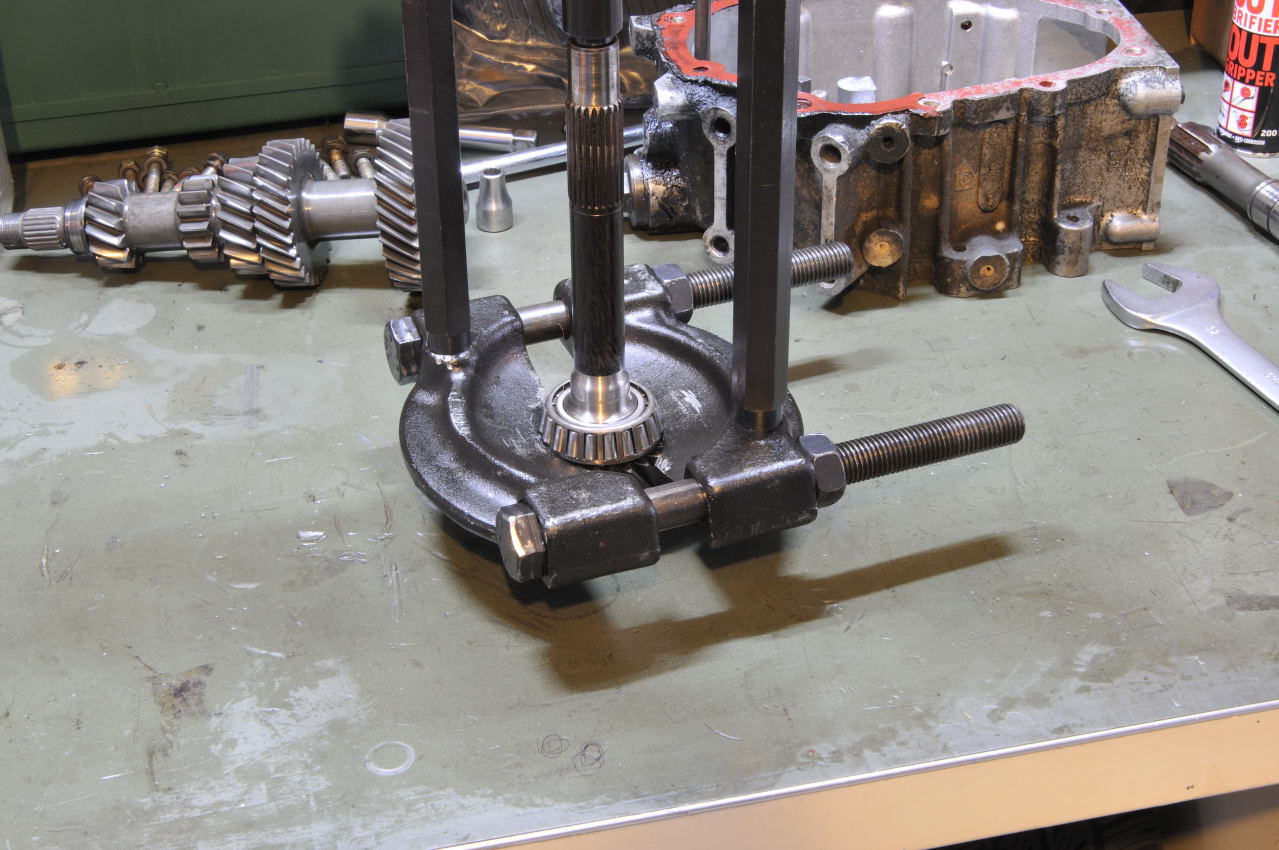On remarque bien que le pignon d'entrainement de l'arbre intermédaire, le crabot de quatième (prise direct) et l'arbre primaire sont une seule en même pièce. J'enléverai la bague extérieure de roulement (qui guide l'arbre secondaire) planquée à l'intérieur de l'arbre plus tard. Je n'ai pas l'outillage adéquate pour l'instant, Land Rover préconise un extrateur à inertie.
