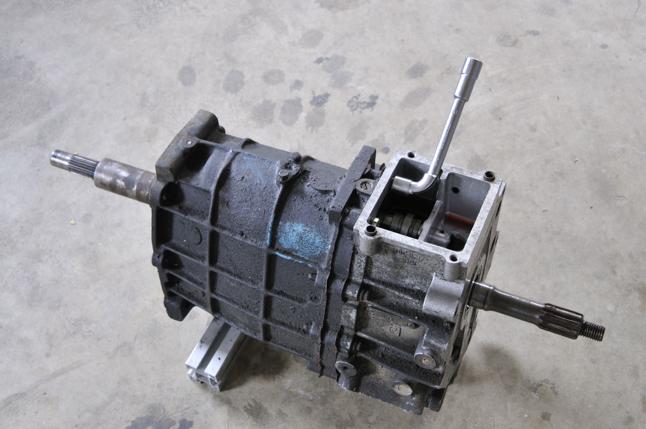 On enlève le circlips qui est sur l'axe de selection. Il sert de butée. Dévisser les deux vis (clef de 10 mm) qui tienne le doigt de guidage axial du tiroir d'interverrouillage Démonté, ce doigt de guidage est branlant et arrive à tourner. Il a du jeu dans sa plaque de fixation et ce n'est plus très étanche. Avant le remontage il faudrait le pointer de nouveau et ajouter de la pâte d'étanchéité. Pour les dernières LT77, il y a un joint torique pour améliorer l'étanchéité. On place enfin le restant de la BV sur le cadre prévu fabriqué par LØLØ. Voir http://www.landroverfaq.com/viewtopic.p ... 5&start=20