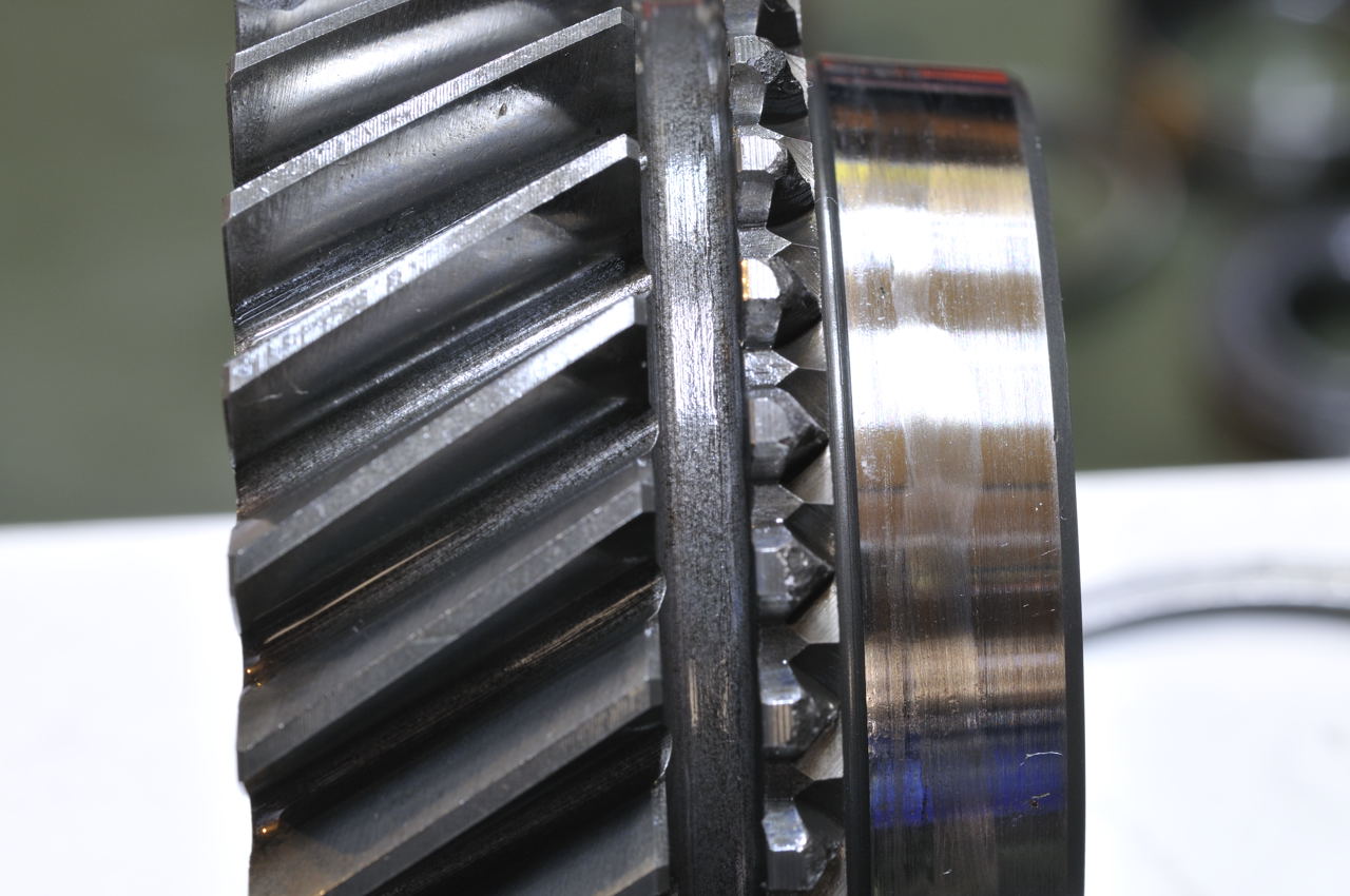Différence entre une bague en bon état et une usée : Pour le pignon fou de 3ième (encore lui !), le cône de frottement est détérioré. AMHA, la bague synchro usée ne permettait plus le lubrifiant de bien aller entre elle et le cône. De plus, toujours pour le même, les dents du crabot sont passablement usées (photo 122). Il devrait normalement y avoir des angles vifs.