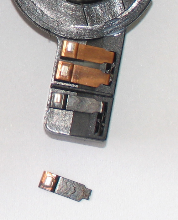 J'ai ouvert le contacteur pour voir si possibilité de réparation en redressant les deux contacts affaissés mais au vu de leur couleur il semblent avoir surchauffé avec perte d'elasticité ,un de cassé et l'autre aves une amorce de rupture et casse si j'avais insisté pour le redresser.