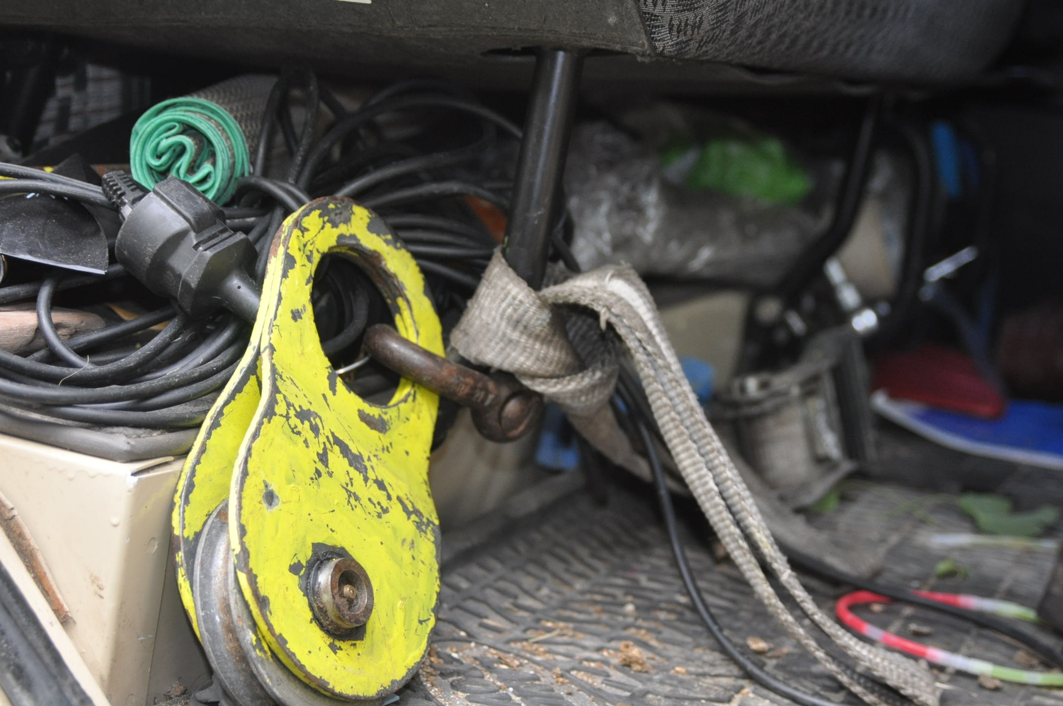 3) Dans les portières, avantage des vielles portes à glissières, il y a des rangements. 4) Sur un aimant, qui m'a plusieurs fois sauvé la vie pour récupérer un clips, écrou... Tombé dans le sable; l'herbe; les graviers... 5) Sous le siège passager bien sûr, je n'ai pas d'électronique : 6) Sous les banquettes arrières: 7) Dans les poches derrière les sièges: Pour le détail du contenue, il faudrait faire la différence entre la pièce de dépannage, et l'outillage à proprement dit