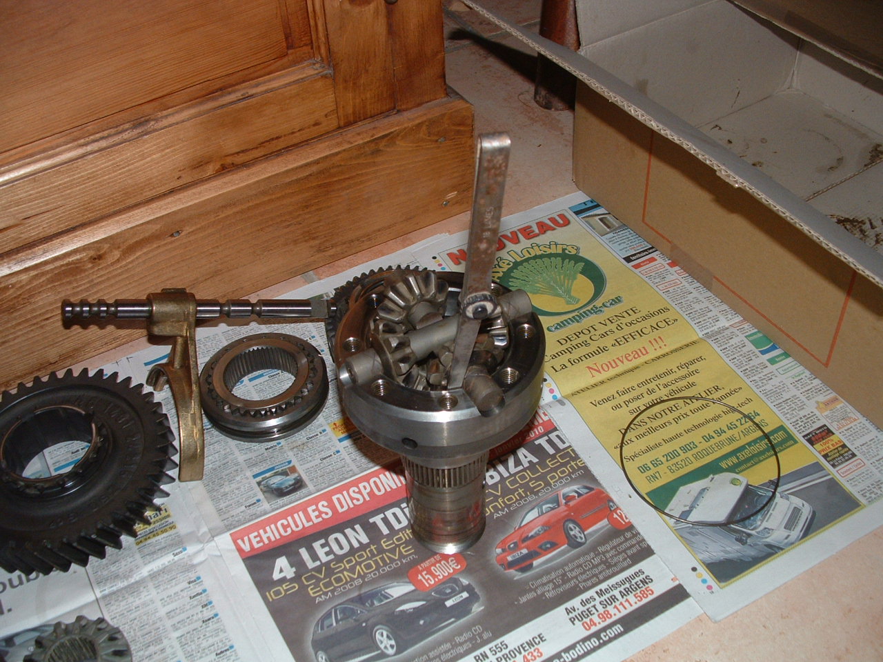 Pour changer mon embrayage, j'ai d'abord déposer la BT de mon disco 300 TDI "last discovery" de 1998 (250 000 bornes) sur les conseils du mécano de LR et vu mon gabarit perso... (plus léger et changement des spis entre les boites).Aperçu de mon montage maison pour la dépose: Derrière le spi de l'arbre d'entrée, j'ai trouvé une petite quantité de copeaux couleur cuivre: je ne vois que les rondelles incurvées au cul des satelites qui soient réalisées dans cette matière, what else?