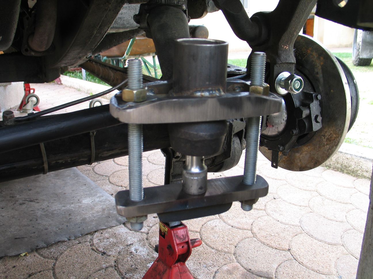 8 ) Mettre une pression écartante, ici à l'aide d'un tube puis taper un bon coup sec avec une massette de 1,5 kg sur la biellette pendante. Sans taper ni le filetage, ni le soufflet en caoutchouc de protection. Revoir la photo de la position du coup de du marteau