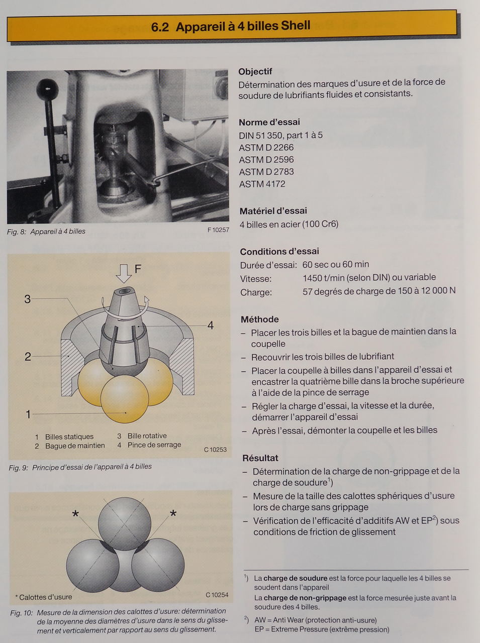 Le test Shell 4 billes, aujourd'hui ASTM D2596 ou DIN 51 350/4, donne une bonne idée du phénomène. Vous mettez trois billes dans une cuvette et vous plaquez une quatrième bille sur les trois premières tout en imprimant un mouvement de rotation relatif entre la bille du haut et les trois autres billes. Les quatre billes sont dans le lubrifiant à tester. Pour une vitesse normalisée, le frottement augmente avec la charge. A partir d'une certaine charge, le frottement est tel que les aspérités dans la surface de contact entre les billes se soudent et s'arrachent, augmentant ainsi le frottement amenant l'arrêt en rotation et une soudure finale entre les billes. la photo ci-dessous montre 4 billes soudées et du reste de graisse plus ou moins carbonisée Si la charge de soudure dépasse 2600 N, le lubrifiant est dit EP, même s'il n'a pas d'additifs EP. Pourquoi 2600 N ? Parce que c'est généralement la limite pour un lubrifiant minéral sans additifs EP.