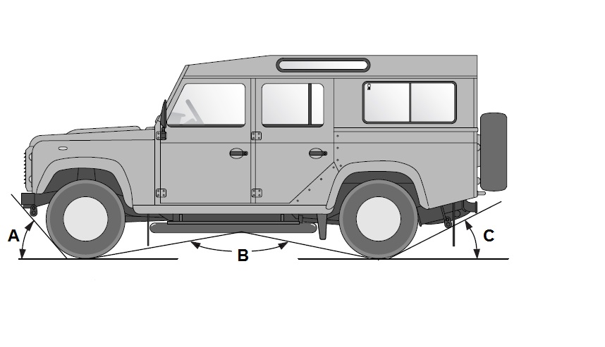 Angle d'approche : C'est l'angle noté A sur le dessin. Plus cet angle est grand plus le véhicule a des capacités tout terrain. Par exemple, plus le véhicule a un angle d'approche élevé, plus il peut s'approcher d'une pente raide sans que l'avant du véhicule touche la pente avant les roues. Angle de fuite : C'est l'angle noté c sur le dessin. Plus cet angle est grand plus le véhicule a des capacités tout terrain. Par exemple, plus le véhicule a un angle de fuite élevé, plus le véhicule a des chances de passer d'une pente raide à sur du plat sans que l'arrière du véhicule racle contre la surface de la pente. Angle ventral : C'est l'angle noté B sur le dessin. Plus cet angle est grand plus le véhicule a des capacités tout terrain en franchissement sans se retrouver posé sur un sommet. API : Institut du pétrole Américain. Cet institut, en plus d'autres activités, défini des normes. Les plus connues sont les normes de niveau de performance des huiles pour l'automobile. Par exemple : API SF pour une huile moteur et API GL5 pour une huile de transmission.