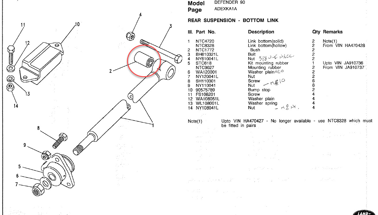 Link (suspension) : terme anglais pour bras ou biellette. "3 link" indique qu'il y a 3 bras (ou biellettes) qui guident le pont (cas pont rigide) où la roue (cas suspension indépendante. Par exemple sur le defender, à l'arrière nous avons deux bras (tirants) notés 2 sur le dessin et un bras triangulaire (A frame) noté 1, donc trois bras de guidage du pont arrière, donc un 3 links. Contrairement à ce que certains pensent, la suspension avant d'un Def (par exemple) l'avant est déjà un 3 links (deux bras notés 2 et une barre Panhard) Les kits "3 link" du marché ayant pour but d'augmenter les débattement à l'avant sont en réalité des "4 links"