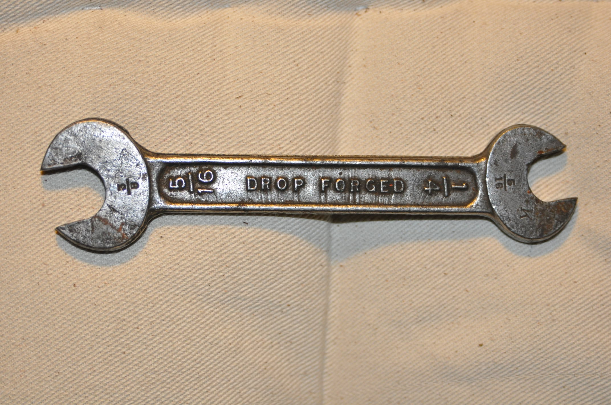 La valeur indiquée sur le corps de la clé (1/4 ou 5/16) indique la dimension en Whitworth, tandis que celle indiquée sur la fourche (5/16 ou 3/8) indique la dimension en BSF (British Standard Fine). Les dimensions indiquées sur les clés BSW et BSF désignent le diamètre de la partie filetée, et non la dimension entre deux plats opposés de la tête hexagonale, comme en AF (across flats : entre les "plats") ou en métrique. Ainsi, des vis 1/4 BSW et 5/16 BSF ont une tête de même dimension et nécessitent donc la même clé, mais la partie filetée a un diamètre et un pas différent (plus fin pour le BSF). Enfin, pour compliquer les choses, il y a aussi le BA (British Association)…