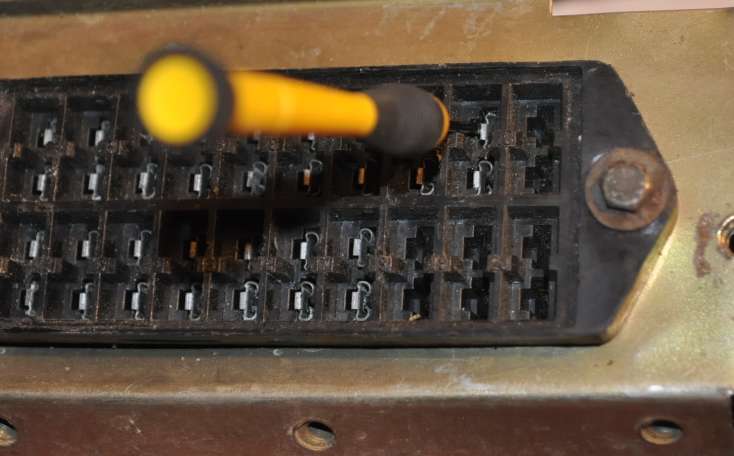 Ensuite, comme l'ergot a été rentré, tu peux voir la marque du tournevis dessus, il faut le ressortir afin de pouvoir de nouveau verrouiller la cosse en position, sur sa petite marche en réintroduisant la cosse dans le support plastique noir par l'intérieur: