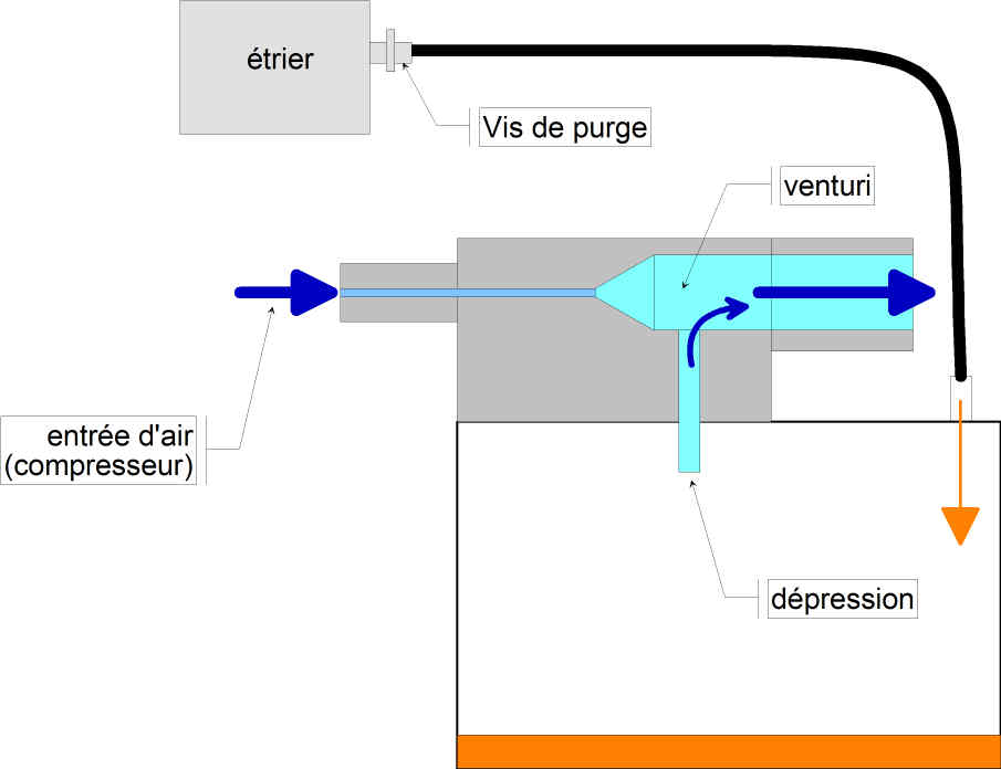 L'air venant d'un compresseur passe dans un venturi, il se crée une dépression qui aspire le liquide de frein dans le bocal.