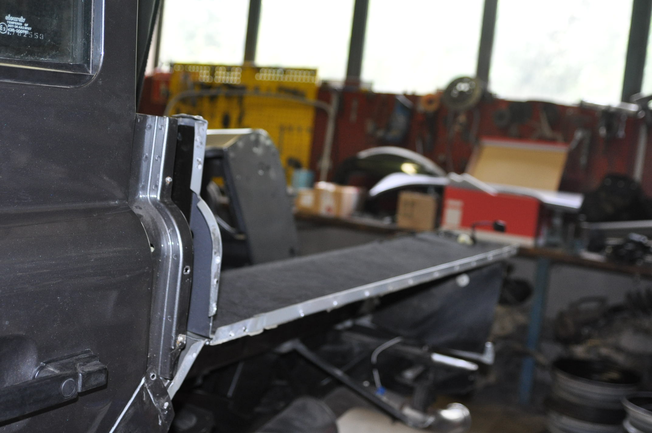 1) Sans cornière en peinture, la cornière de ceinture de caisse est aussi riveté: 2) Avec la cornière: 3) Panneau en cours de ponçage, on distingue les endroits des soudures par point. L'angle de renfort de support de charnière en haut a gauche est aussi riveté.