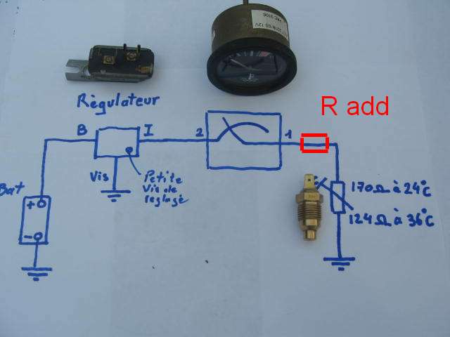 1)Les sondes sont souvent des CTN (Coefficient de Température Négative) la valeur Ohmique de la sonde diminue avec la température: Donc plus cela chauffe, moins il y a de résistance, et moins il y a de résistance plus il y a de courant donc plus ton galvanomètre dévie vers la droite. 2) Il faut intercaler une petite résistance additionnelle en série afin de limité un peu plus le courant et avoir une valeur ohmique correspondant a la graduation N. Le plus simple étant d'utiliser une boite a décade qui en gros est une grosse résistance variable a lecture direct. Tu l'intercale dans le circuit et tu tourne les boutons jusqu'à l'obtention de la graduation souhaitée, tu relève la valeur et c'est fini. Sinon tu prend un potentiomètre de 220 Ohm linéaire multi-tour, tu l'intercale, tu règle, puis tu mesure sa valeur entre le curseur et l'extrémité câblée.Tu peux même le laisser derrière le tableau de bord du land.