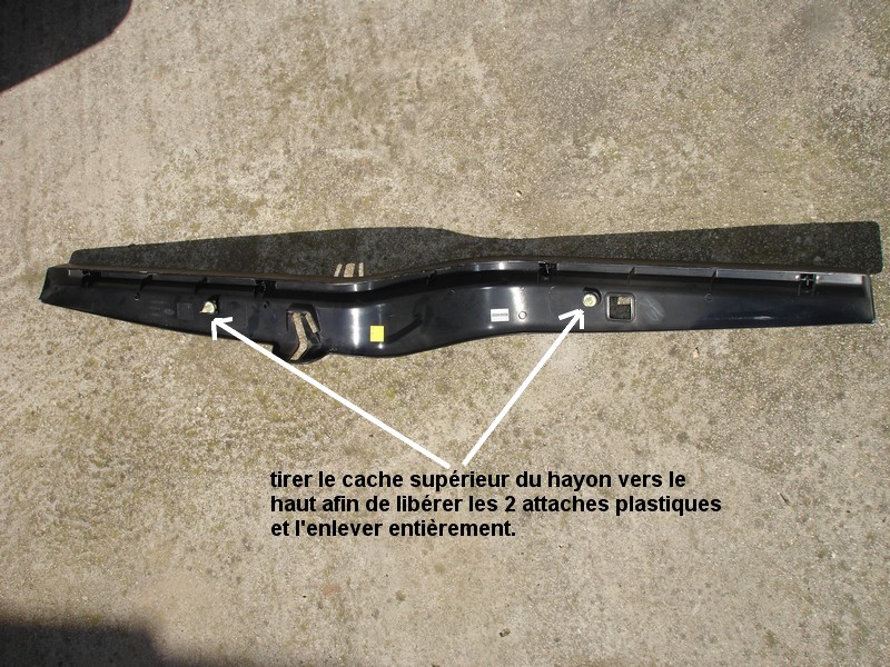 - il faut d'abord enlever le cache de la partie basse du coffre par l'intérieur. en fait il ne s'enlève pas complètement car les rotules de tenue des cables retiennent les cotés. Avec un tournevis que j'ai coudé a 90° je suis passé entre le cache superieur et la garniture basse du coffre et j'ai dégraphé cette garniture (c'est galere donc ne pas s'enerver) ensuite on peut tirer sur cette garniture en la déformant sachant que les cotés sont tenue par les rotules