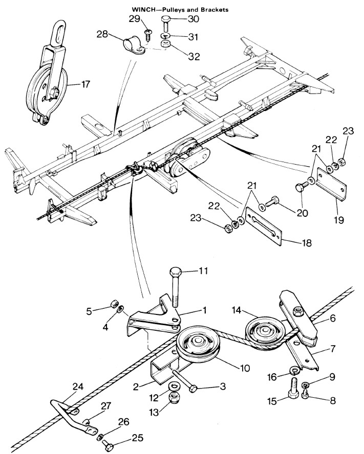 il suffit de ne pas laisser trainer le câble. Quand il est enroulé il est semi-tendu, et quand tu t'en sers, tu tires dessus pour le sortir, tu l'accroches à un point d'attache , puis tu le tends avec le treuil. Il n'y a aucune raison qu'il vienne pendouiller n'importe comment. Sur les poulies il faut bien sur prévoir une garde qui empêche le câble de tomber de la gorge dès qu'il est détendu.