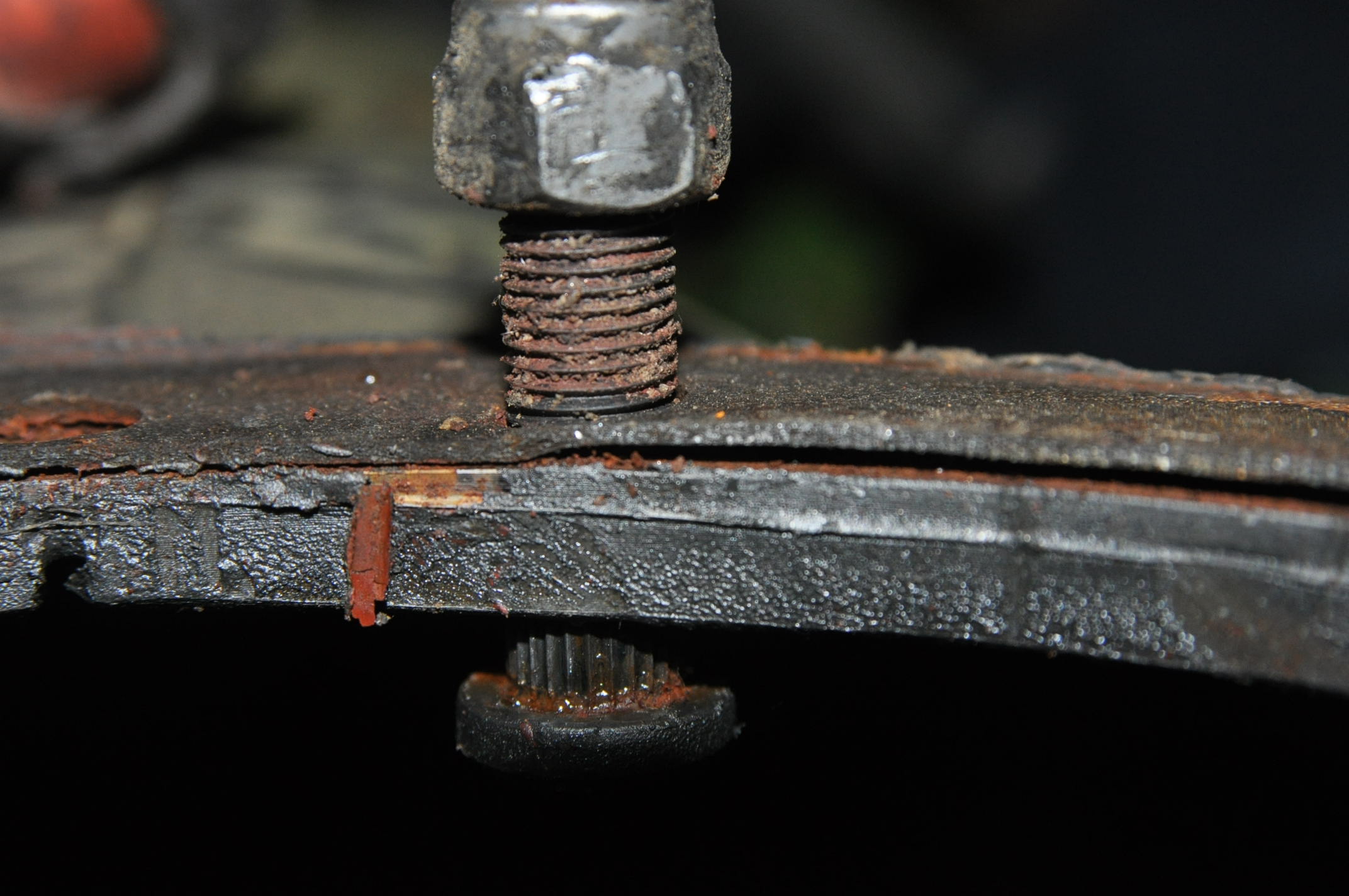 1) Les 4 vis courtes concernées dont te parle OLIV29, sont celles sans les écrous sur la partie médiane à 9h et à 3h sur la photo: 2)La longue est sortie en un coup, la courte est presque sortie, mais j'ai dut taper nettement moins fort pour contrôler sa sortie. 3) Il fallait saisir ce moment là, pour la compréhension du système de blocage, c'est le même principe que les goujons de roue. 4) L'orifice de la vis où l'on peut voir les marques des 26 cannelures