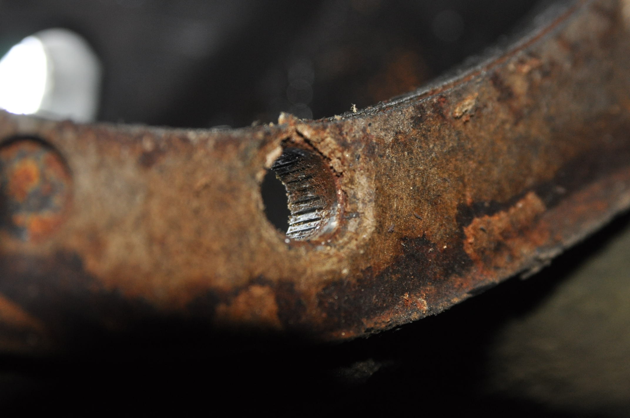 1) Les 4 vis courtes concernées dont te parle OLIV29, sont celles sans les écrous sur la partie médiane à 9h et à 3h sur la photo: 2)La longue est sortie en un coup, la courte est presque sortie, mais j'ai dut taper nettement moins fort pour contrôler sa sortie. 3) Il fallait saisir ce moment là, pour la compréhension du système de blocage, c'est le même principe que les goujons de roue. 4) L'orifice de la vis où l'on peut voir les marques des 26 cannelures
