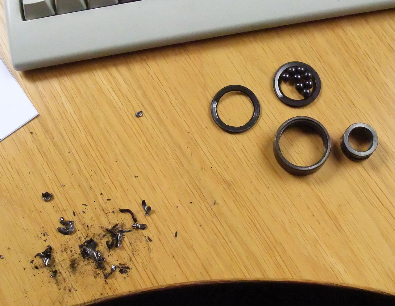 AMHA, le roulement a fonctionné avec une précharge importante provoquant un échauffement important et la lub n'a pas supporté le traitement. Il ne reste d'ailleurs que des morceaux de graisse carbonisée (comme de la poussière de carbonne).