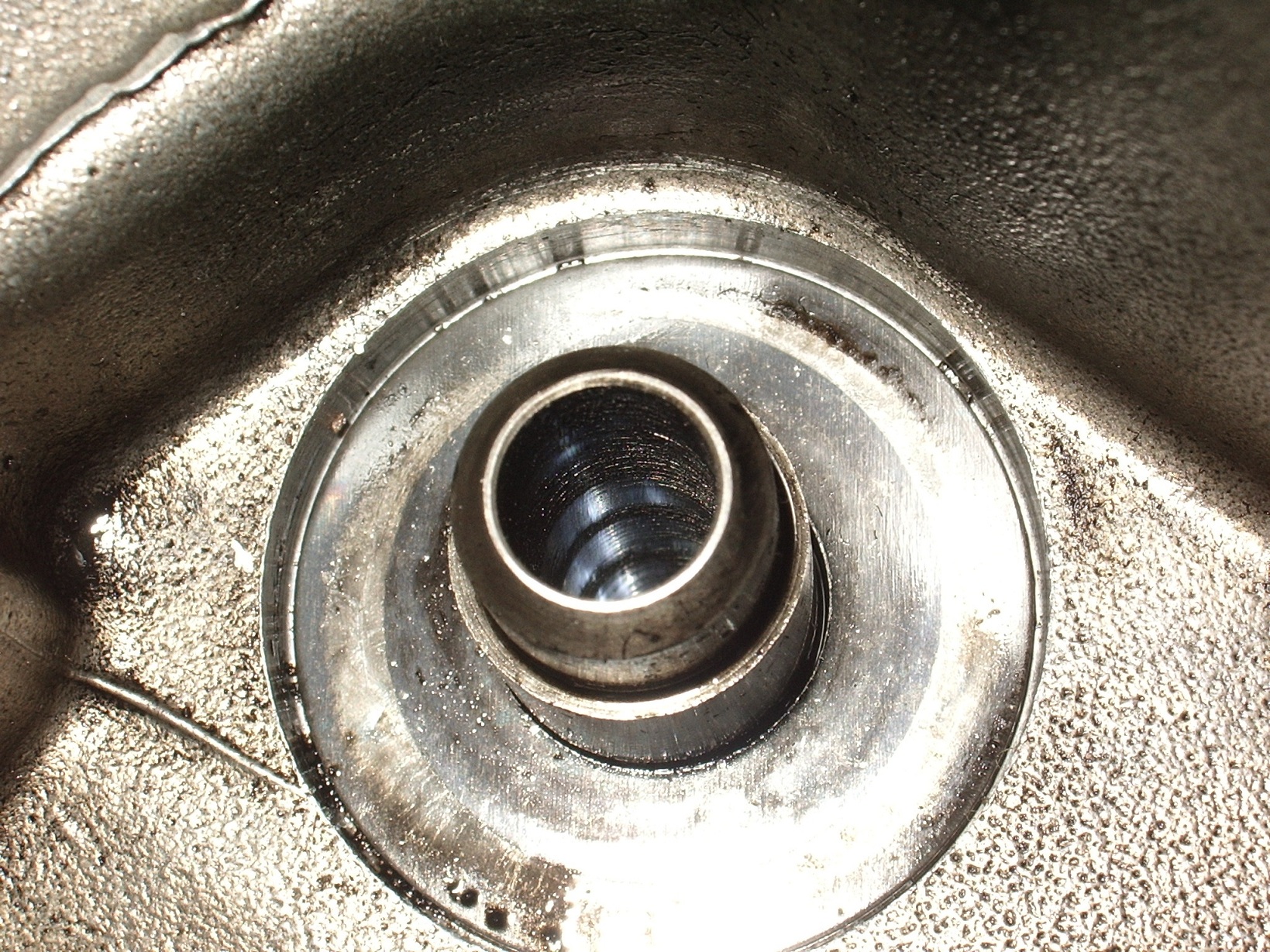 Dans un premier temps, je croyais que la soupape était tordue je n'ai pas fait attention (je m'en suis rendu compte à la deuxième), et j'ai donc sorti la soupape en tirant sur sa tête et en la tournant. Sur la photo suivante, on voit bien les marques que cela a laissé à l'intérieur du guide lors de l'extraction de la soupape.