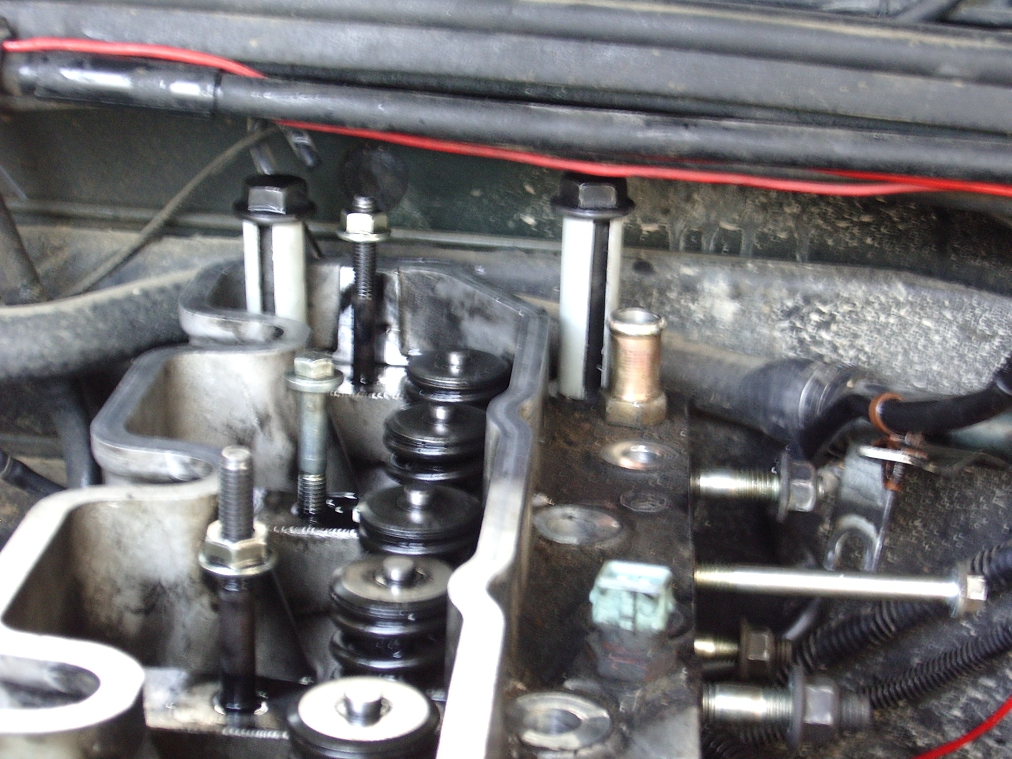 toutes les vis enlevées, il reste la 1 et la 3 qui coincent à cause du tablier.... un manchon de gaine électrique rigide les maintiendra soulevées le temps que je sorte la culasse...