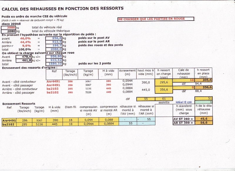 Cela, SANS AUCUNE CALE DE REHAUSSE….juste en tenant compte dans le calcul théorique des ressorts mis en place, des rondelles d’origine LR supports de chapelles de 10mm d'épaisseur à l’av et de la répartition des charges av et ar au dessus des ressorts.