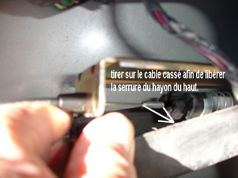 - pousser ce cache de façon a arriver a toucher le cable qui est a l'interieur et tirer sur le cable. C'est magique le hayon est dévérouillé