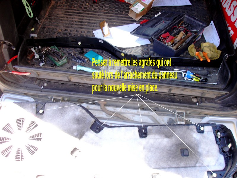 - il faut d'abord enlever le cache de la partie basse du coffre par l'intérieur. en fait il ne s'enlève pas complètement car les rotules de tenue des cables retiennent les cotés. Avec un tournevis que j'ai coudé a 90° je suis passé entre le cache superieur et la garniture basse du coffre et j'ai dégraphé cette garniture (c'est galere donc ne pas s'enerver) ensuite on peut tirer sur cette garniture en la déformant sachant que les cotés sont tenue par les rotules