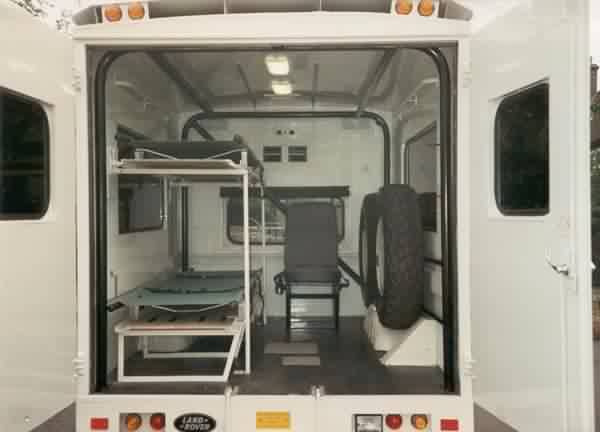 Naguère, dans les transformations de type ambulance, où les portes arrières sont très sollicitées (ouvertures-fermetures fréquentes), il y avait sur les 130 deux roues de secours intérieures positionnées comme cela (conversion chez Foley) :