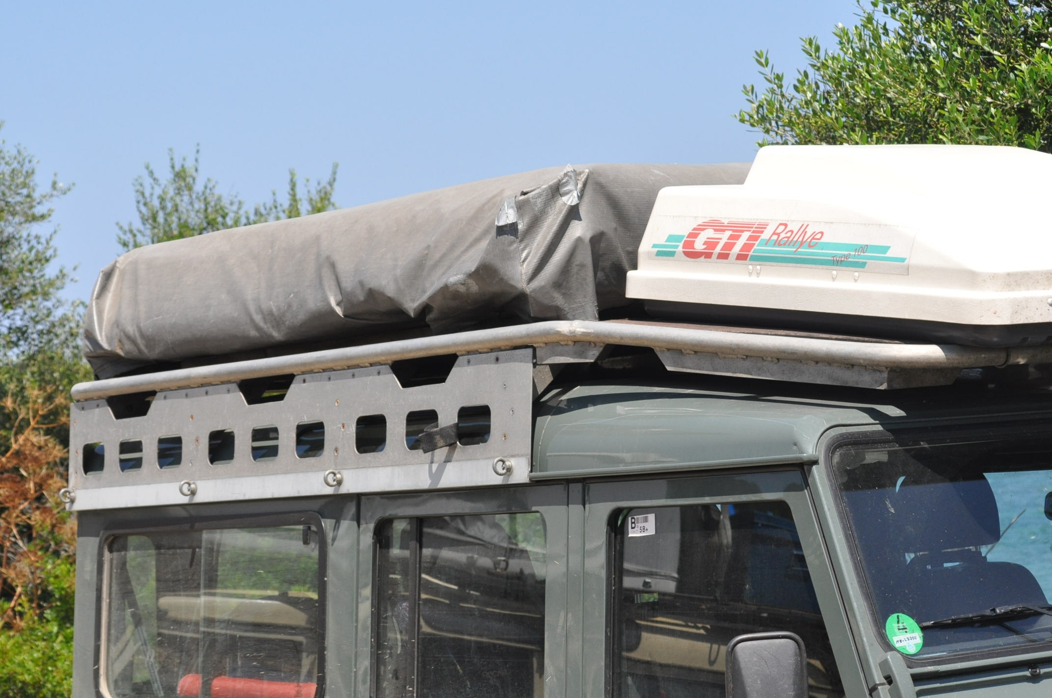 2) Galerie réalisé début juillet avec de la récupération en une journée a deux , sans plan, avec beaucoup de boisson anisé :wink: . La photo illustre l'inconvénient qu'aurait un rebord si tu a une tente de toit a accès latérale ce concepts est déjà embêtant car il t'oblige a te trimbaler une échelle qui est toujours située devant la porte que tu souhaite ouvrir, t'oblige a faire l'acrobate pour te déshabiller, et les pompes tu les mets où? Les grosses pompes, pas les sandalettes que tu coince entre la galerie et le toit. Cette galerie est basique, légère, et a passé l'épreuve de 1000km de piste avec 4 points d'ancrage par crapeau seulement.