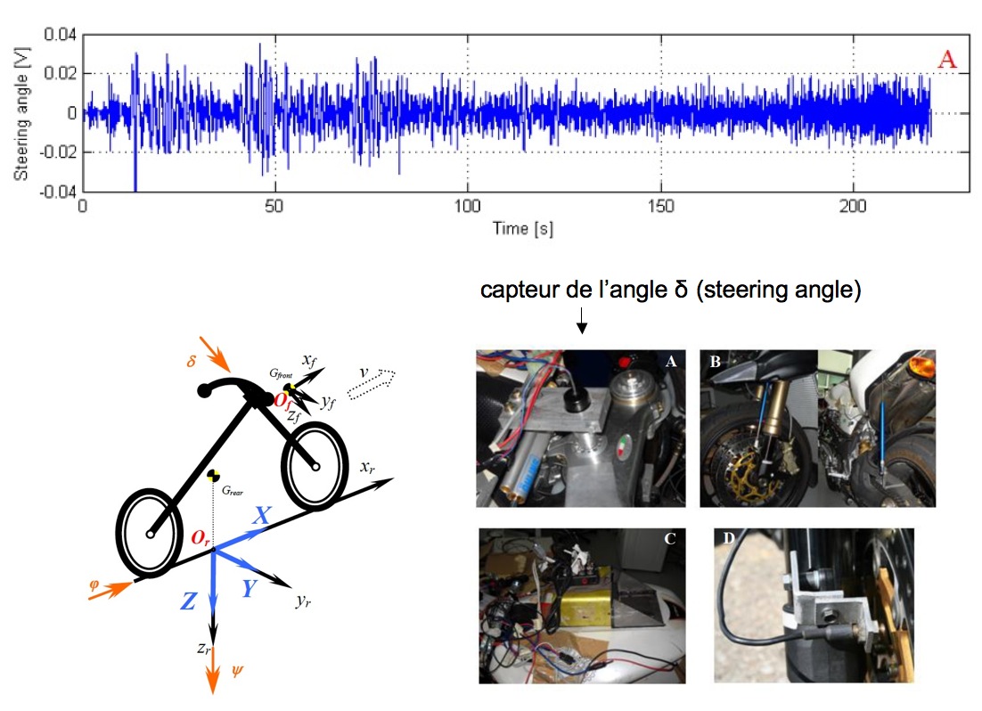 L'enregistrement sur le graphe montre les variations de l'angle de rotation (δ) par rapport à l'axe de direction, en fonction du temps. Elle est à 20 km/h pendant 50 sec, et la vitesse augmente par palier de 10 km/h toutes les 50 sec suivantes, jusqu'à 60 km/h.