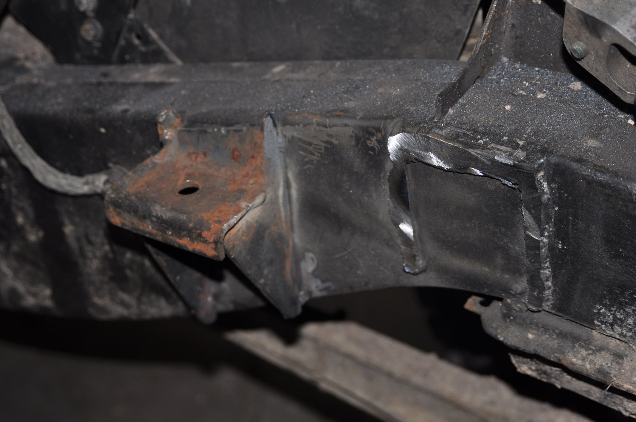 35) Le support n'est pas encore pointé, un peu plus haut, un peu plus bas, les coulissaux n'ont pas bougés, c'est bon... 36) Tu pointe!!! 37) A l'autre: 37) Une fois que tu as pointé les deux supports, présente la descente d'échappement et l'échappement, il faut souder une patte de maintien d'un silenbloc, tu repère l'endroit par rapport au crochet qui est sur la ligne d'échappement du 300. Tu la pointe aussi, vas voir: Adaptation moteur + boite Disco 200TDI dans un 110SW 2.5 D sur la photo 8 ) elle est située entre la boite de transfert et le longeron.