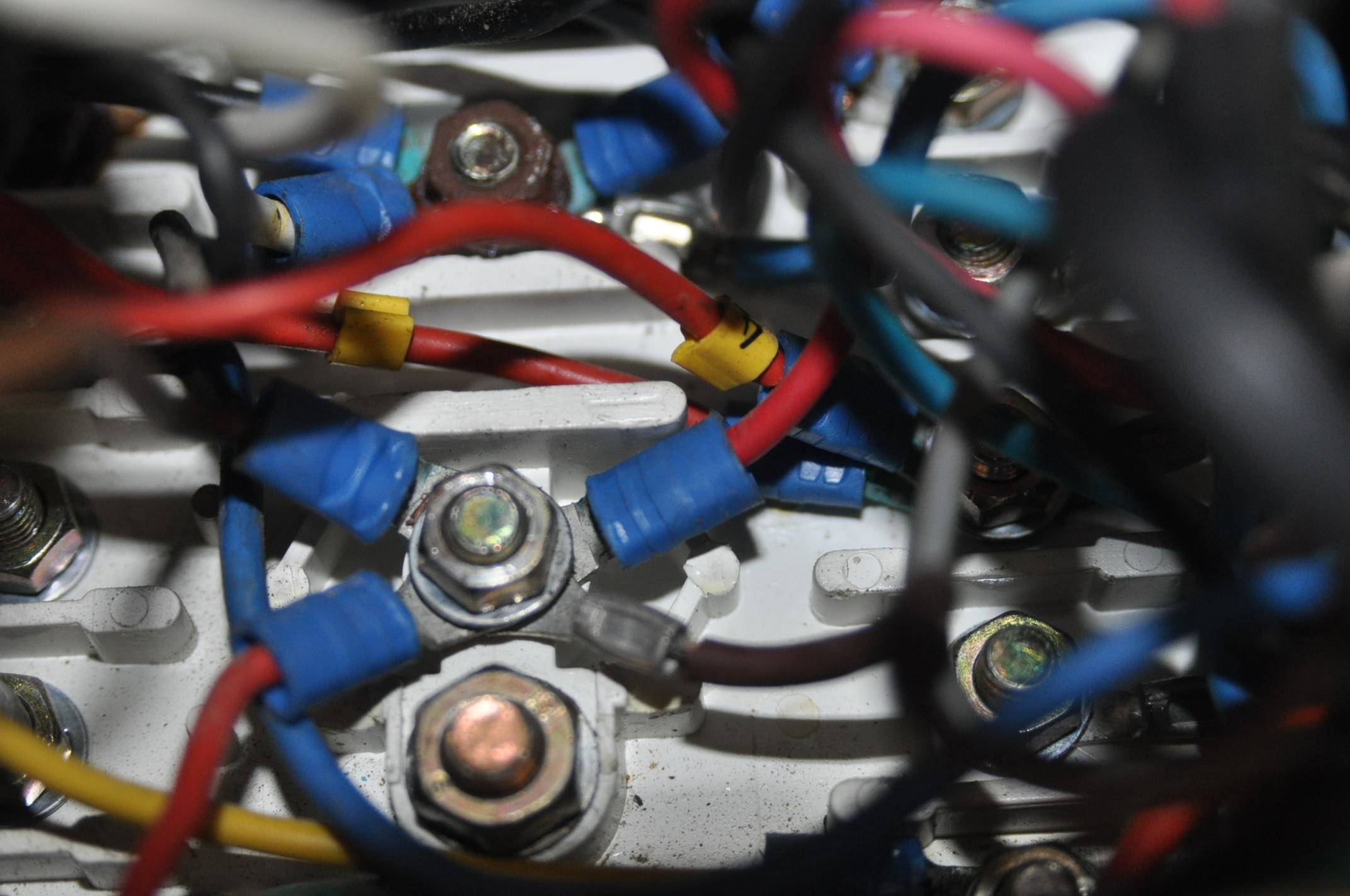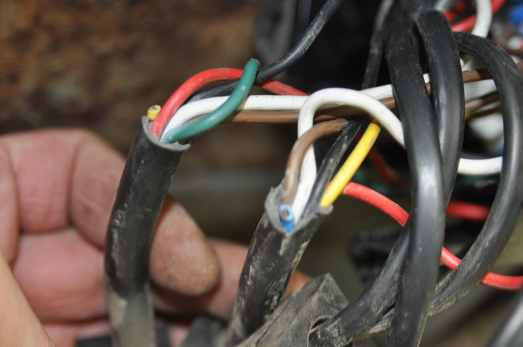 4) En écartant un peu les tripes, on peut identifier la connexions des veilleuses. Identifiable aux 6 fils sur le même écrou de 8.