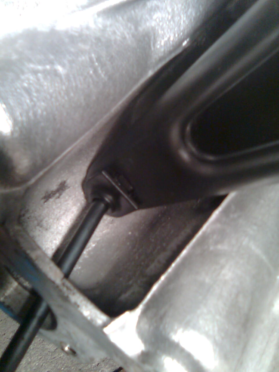 Démontage du récepteur et du support d'amortisseur pas de problème particulier sinon que l'axe qui pousse la fourchette est resté dans la cloche d'embrayage. Comme l'axe était bien clipsé j'ai pu le récupérer et le sortir. La fourchette est à 10 cm de la surface de fixation du récepteur hyd. Je suppose un problème de fourchette ou de butée.