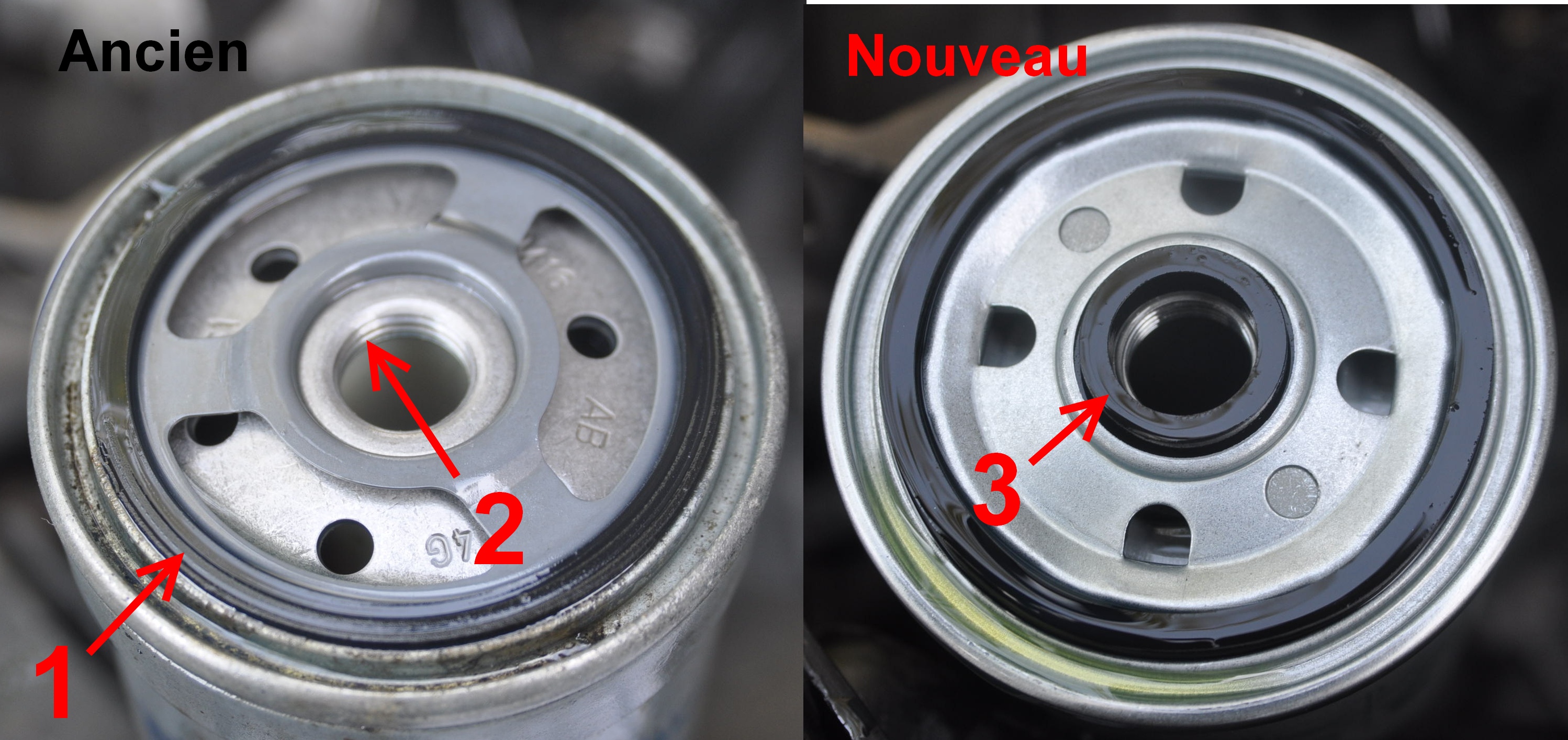 1) Démonter le vieux filtre à l'aide d'une clef a filtre: 2) Comparer l'ancien et le nouveau filtre: