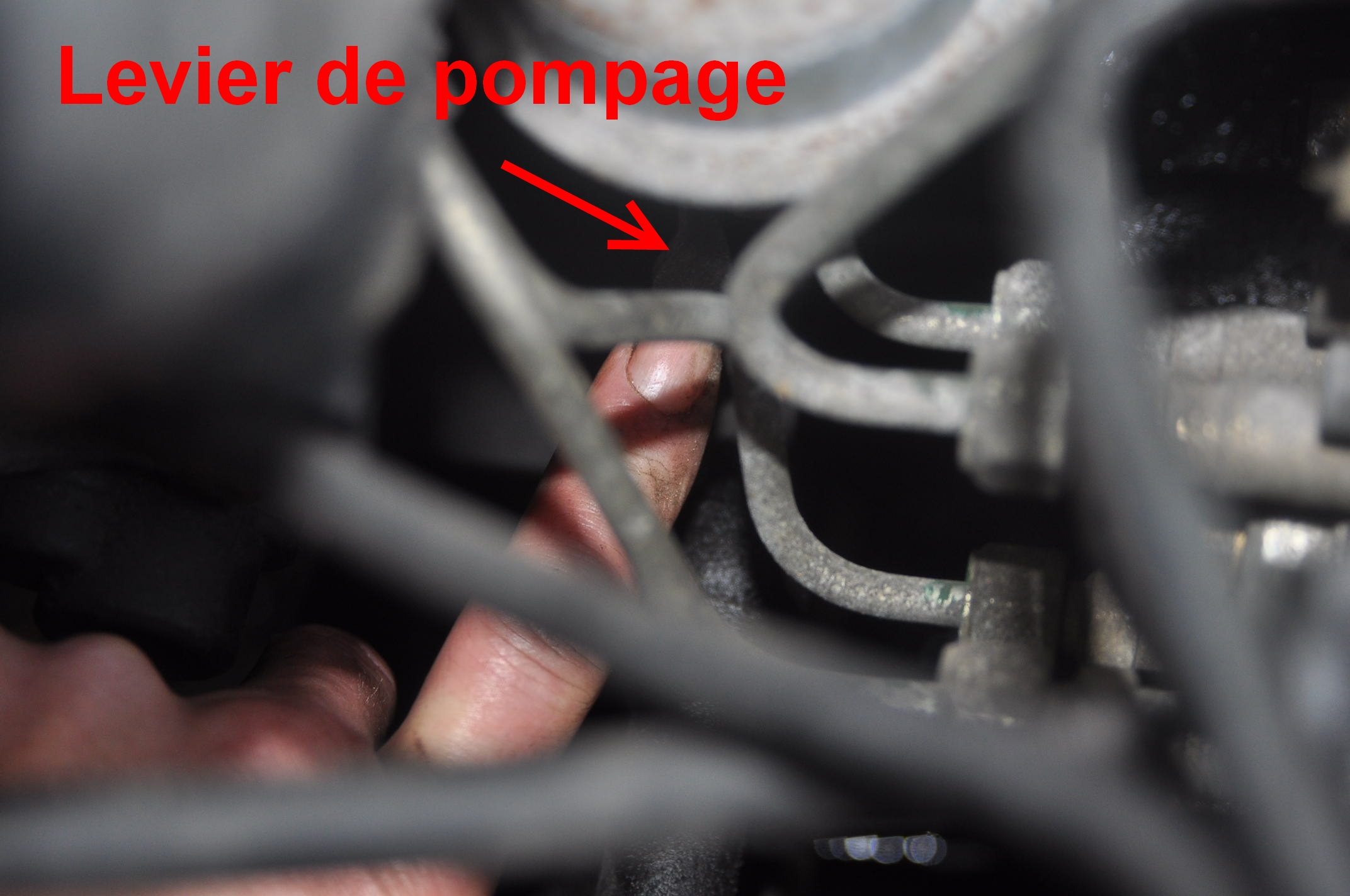 Pour se faire, il faut d'abord desserrer la petite vis de 10 placer sur le haut du support de filtre à gasoil: Puis actionner le levier sur la pompe de relevage. Il faut appuyer dessus, si tu ne sens pas d'effet de pompage, en gros que c'est tou moue, c'est que la came interne au moteur maintient en appuis la pompe. Dans ce cas il faut donner un légé coup de démarreur pour quelle change de position afin de pouvoir pomper correctement pour remplir le filtre à gasoil et chasser l'air ou "réamorçer" comme l'on dit dans le langage courant. 4) Tu constates la fin du remplissage, lorsque du gasoil commence à sortir de façon régulière, à chaque coup de doigt sur la pompe. Tend qu'il y a des bulles qui sortent, il faut pomper: