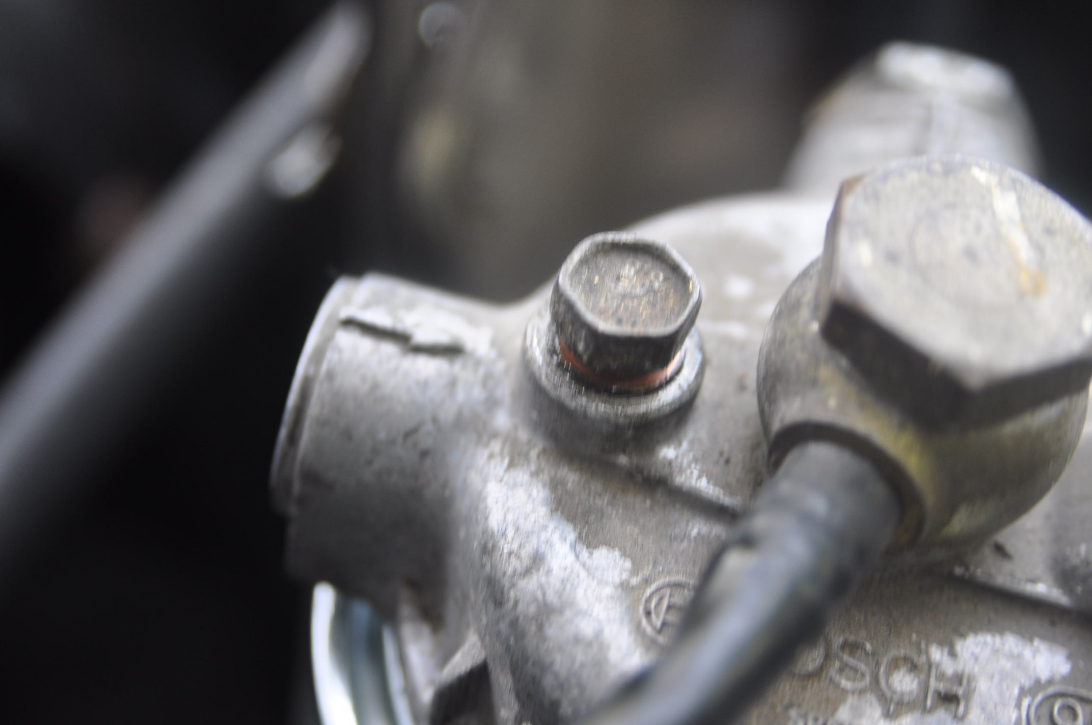 Là, c'est tout sec encore: Là ça dégueule, sans bulle. Donc il suffit de resserrer la vis de purge pas trop fort, il y a un joint cuivre. De même que le filtre a gasoil n'a besoin d'être serré trop fort.
