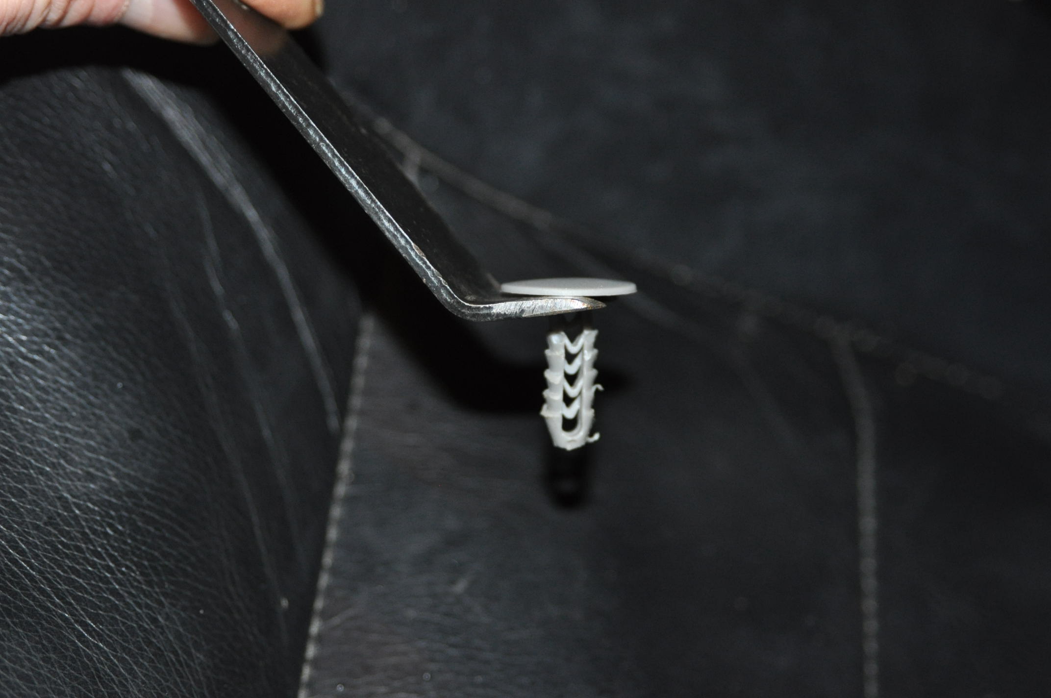 1) Plier dans un étau, quelques coups de disqueuse et le tour est joué. 2)Le plus dur, c'est de ne pas marquer le ciel de toit lors de l'extraction. Un bout de carton sous le talon du pied de biche peut faire l'affaire afin d'éviter ça. 3) Le modèle sur la photo est un restagraf tu peux les trouver dans des petites pochettes de 10 chez AD. l'inconvénient, elles sont en diamètre 6,5mm au lieu de 6 donc il faut repercer. Sinon tu peux les trouver d'origine chez Land Rover sous la ref MWC9832LUH. 4) Pour repercer, il faut limiter la course du foret pour le pas taper au delà du renfort. Selon le type de modèle de ciel de toit par rapport à l'année, dans certain cas les trous ne tombent pas ou plus en face, il te faut les repercer. Tu positionne le ciel de toit, avec les vis de pare soleil et des poignées et tu reperce dans les trous existant. Pense aux fils des plafonniers, HP, antenne CB, alarme, et autres options du genre fixations de rideaux, avant de fermer.