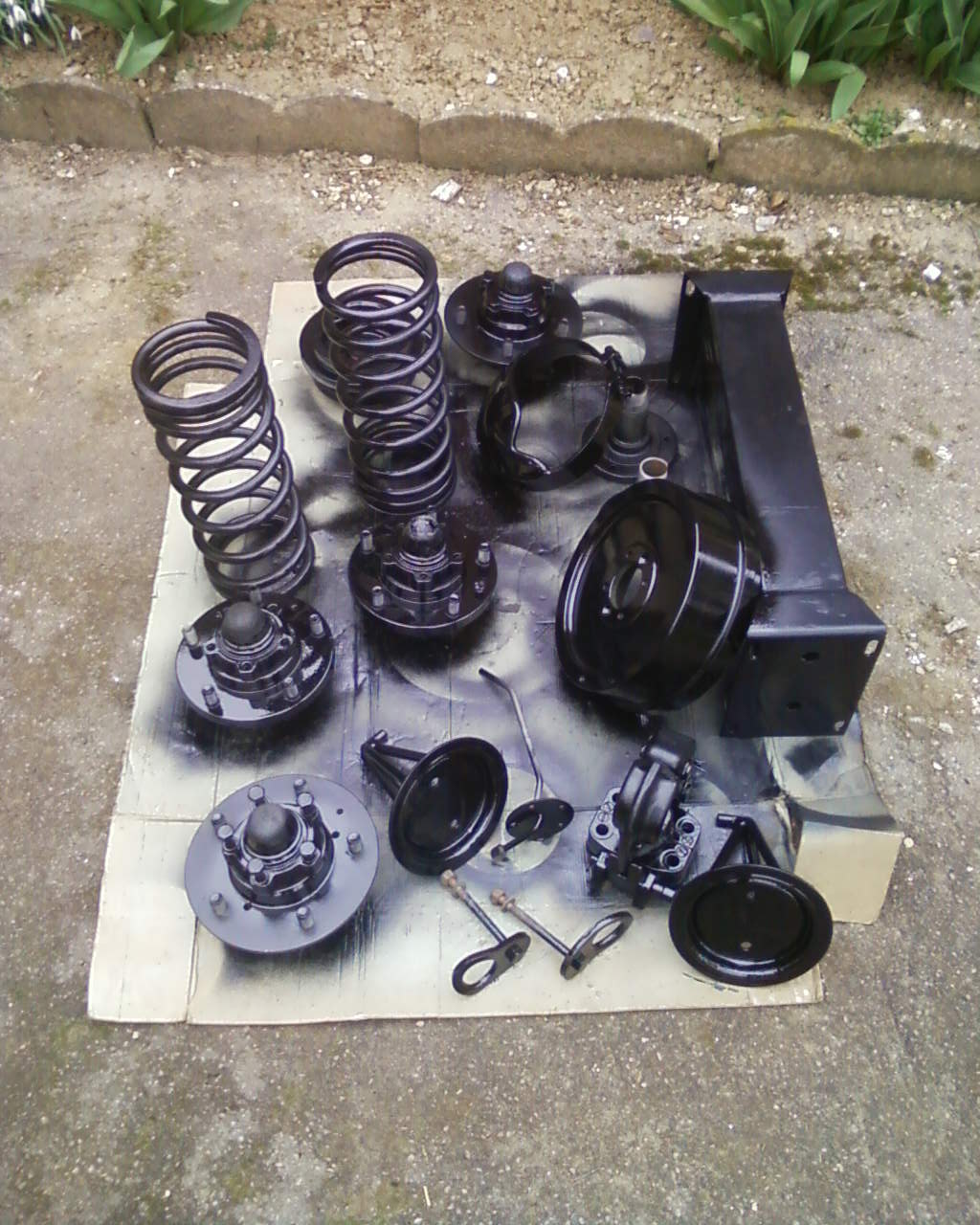 Pour tinkerland, l'ecarteur artisanal, bon que les photos pour l'instant, les cotes sont resté a l'atelier! Sinon, les portes avancent bien, le pont arrière est peint, les roues d'été aussi ainsi que quelques bricoles, et j'ai demonté la rotule arrière car le soufflet été craqué! La suite demain,