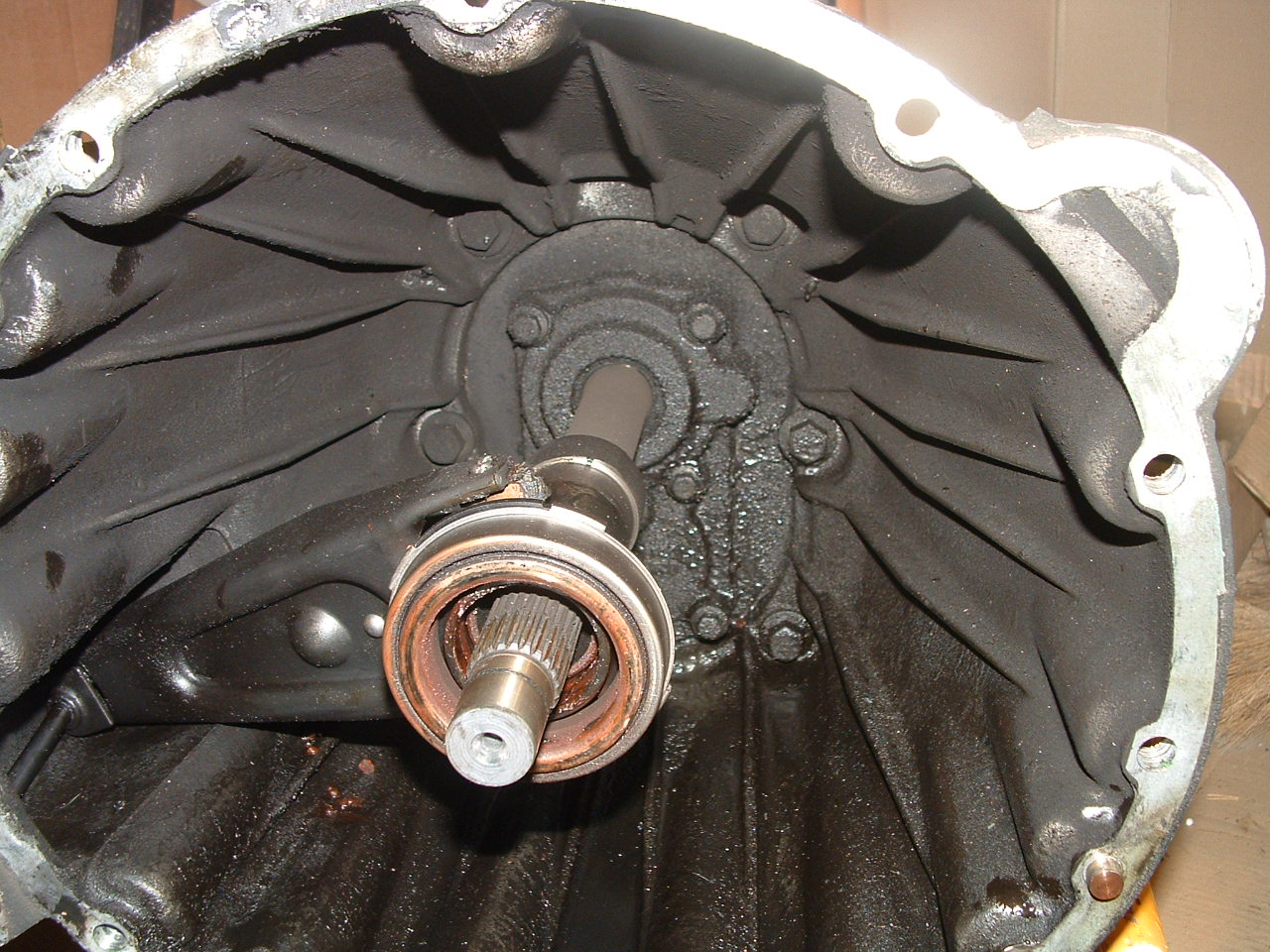 Démontage du récepteur et du support d'amortisseur pas de problème particulier sinon que l'axe qui pousse la fourchette est resté dans la cloche d'embrayage. Comme l'axe était bien clipsé j'ai pu le récupérer et le sortir. La fourchette est à 10 cm de la surface de fixation du récepteur hyd. Je suppose un problème de fourchette ou de butée.