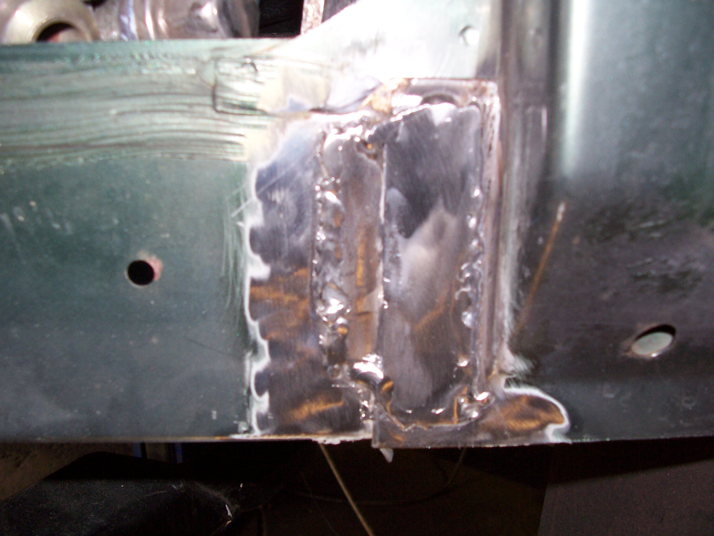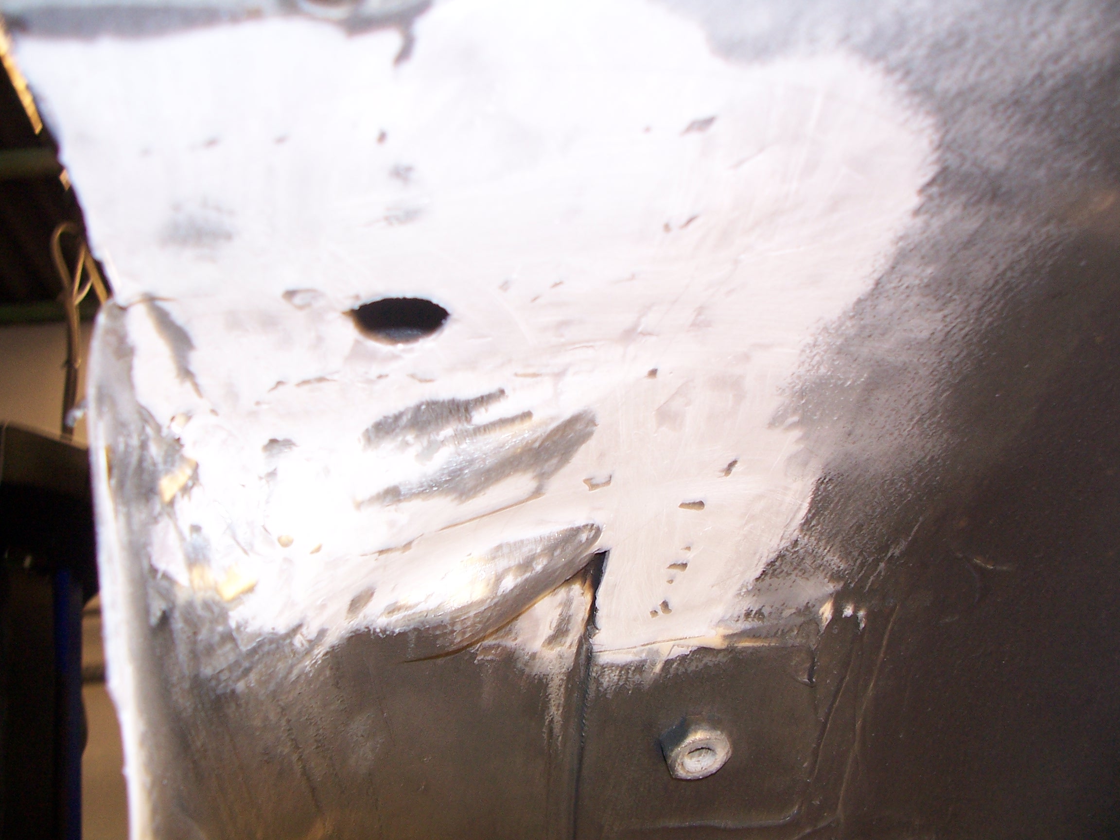 23) Une découpe affiné en utilisant le bout de tôle enlevé comme patron. Puis soudure au MIG sur la périphérie et meulage.