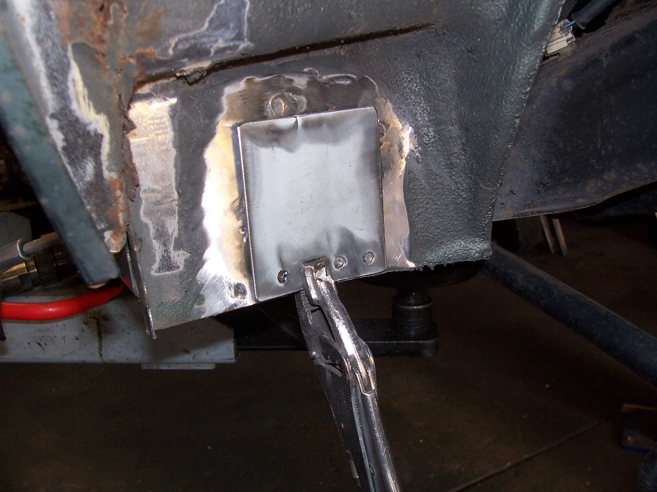 23) Une découpe affiné en utilisant le bout de tôle enlevé comme patron. Puis soudure au MIG sur la périphérie et meulage.