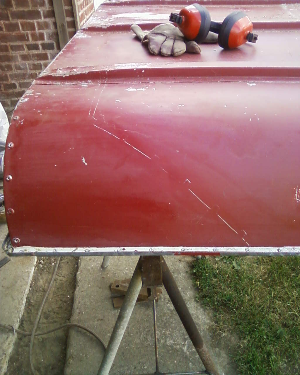 J'ai attaqué le toit, poncage, remise en place des bosses au marteau avec un fer plat et un gant (a la Marcel) ainsi que de la partie arrière (qui se prené pour un aileron), bouchage du trou d'une ancienne antemnne et mastiquage des grosses rayures!