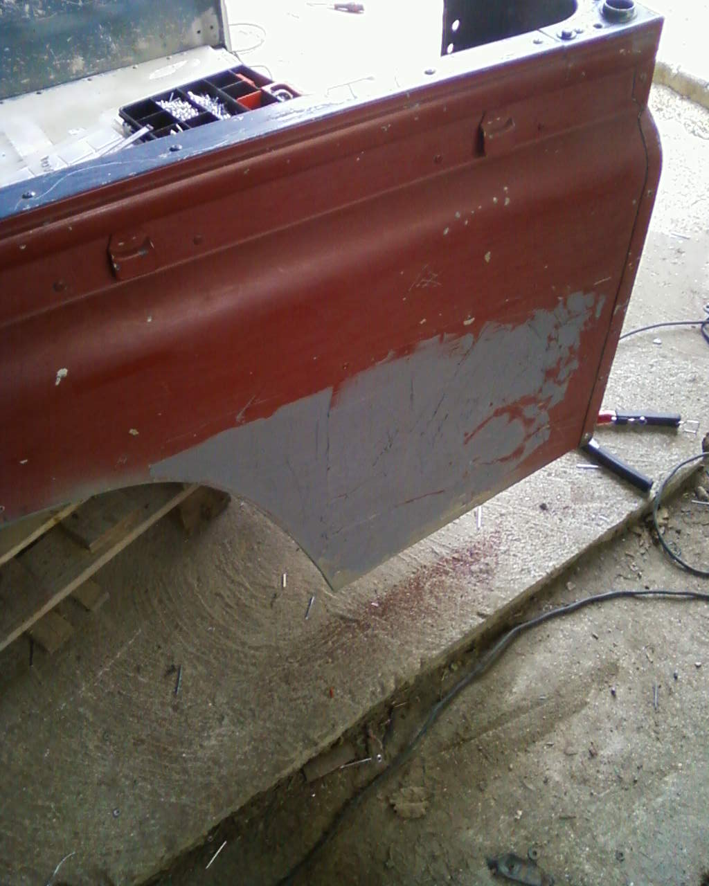 l'intérieur de la caisse avec mes boites dans les ailes la réparation des pieces au mastic la mise en apret et peinture des pieces de carrosserie sauf que comme je suis pas un grand spécialiste de la peinture, j'ai louper la caisse arrière et le toit, ca a un aspect peau d'orange donc le lendemain, poncage au 800 a l'eau et application d'un voile pour corriger le montage des ailes et de la calandre le compartiment moteur avec les tuyau d'admission dans tous les sens! et la je suis bloqué sur le positionnement du filtre a air!