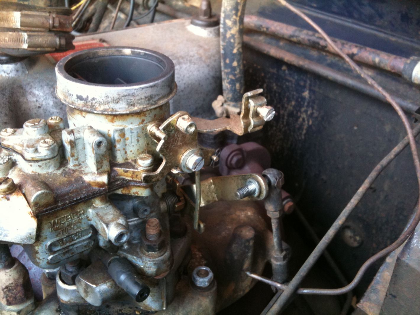 On peut voir sur cette photo la commande des gaz qu'il faut detacher pour sortir le carbu, ainsi que la durite de depression qui va a l'allumeur ainsi que l'arrivee d'essence...et une autre durite qui va du bas du carbu cote bloc moteur au durites d'air dont je ne connais pas le role...