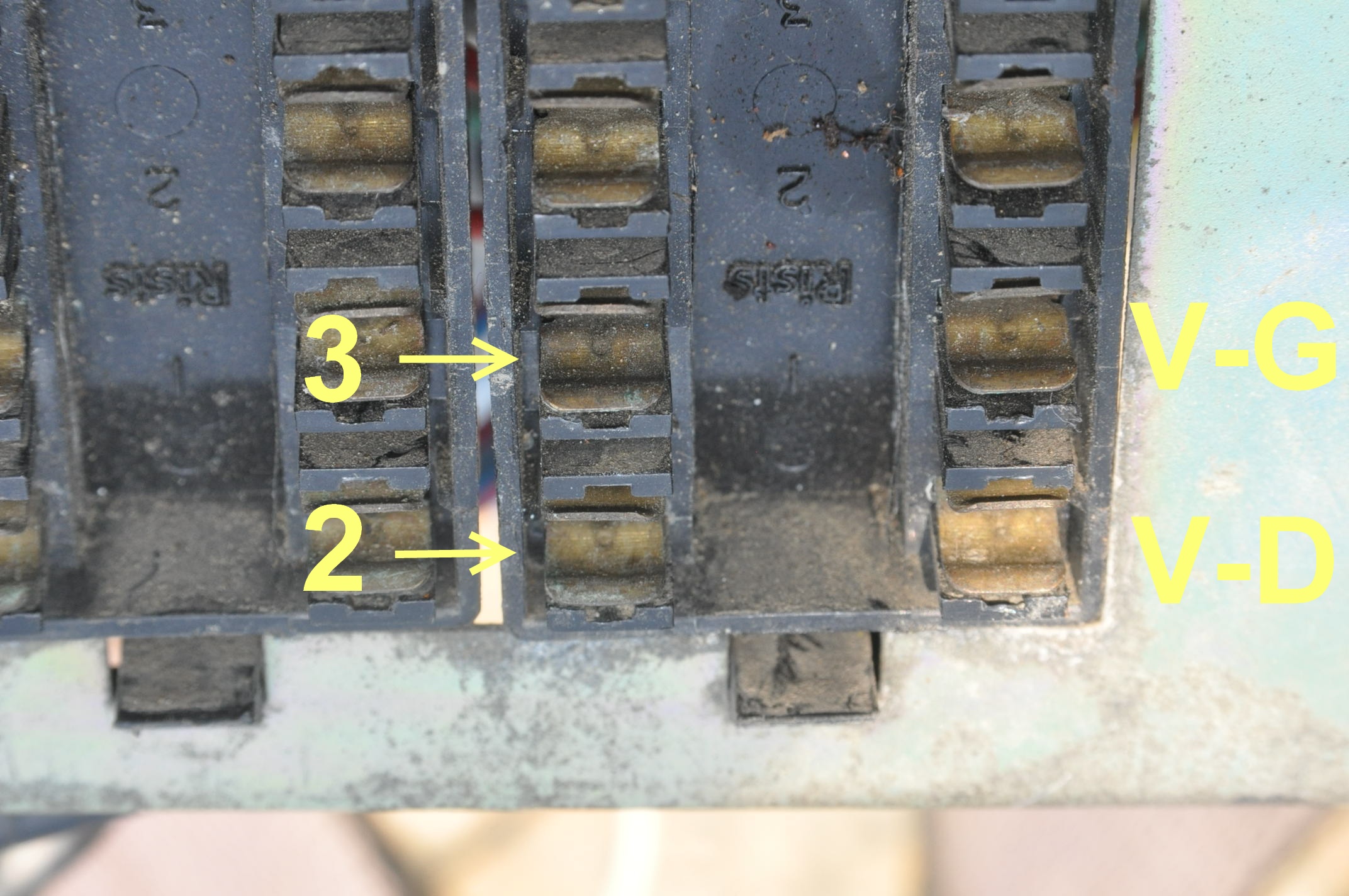 V-G et V-D sont les départs protégés par les fusibles vers le circuit des veilleuses. Les repères 2 et 3 sont l'arrivées du +12V.