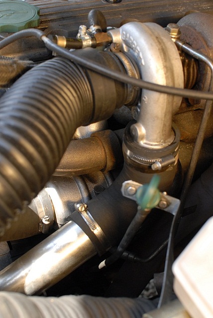 Turbo orienté vers le haut, pour cela il a fallut trouver les collecteurs d'échappements et d'admission d'air spécifiques au Defender. Ainsi que la première tubulure de descente d'échappement (celle qui se raccorde au Turbo).