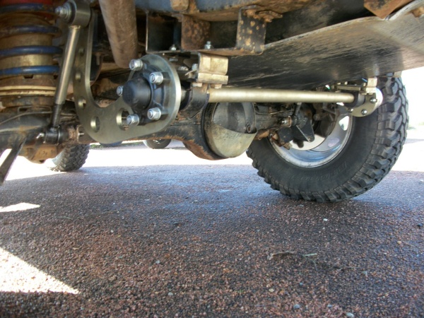 3c- Avec une adaptation "Maison" (en rallongeant des biellettes de chaque coté et la pièce de gauche coté pot d'échappement suivant un rayon de 25,4cm), il est possible d'améliorer jusqu'à 45° d'inclinaison les Tirants de Pont équipés d'Embouts à Rotules par rapport au châssis avec des amortisseurs de 35 à 38cm de variation de course totale...13cm de compression et autour des 23 à 25cm de détente d'amortisseur (au lieu des 13 et 8cm d'origine lr).