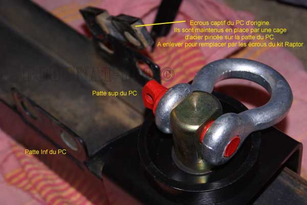 4) Au niveau des pattes de fixation inférieures, DANS le longeron (là où s'insère la patte inférieure du "U" raptor), glisser la cale d'épaisseur fournie avec le kit. Le mieux à ce niveau est d'insérer simultanément une vis (les nouvelles...bien sûr :roll: ) pour "accrocher" un trou de cette cale et faire qu'elle s'aligne correctement.