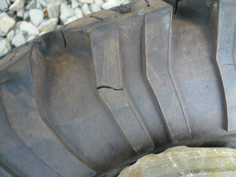 Voici le détail d'un crampon fissuré sous trois angles . Pourquoi le pneu ne porte pas de trace d'impact avec "le coupeur"?